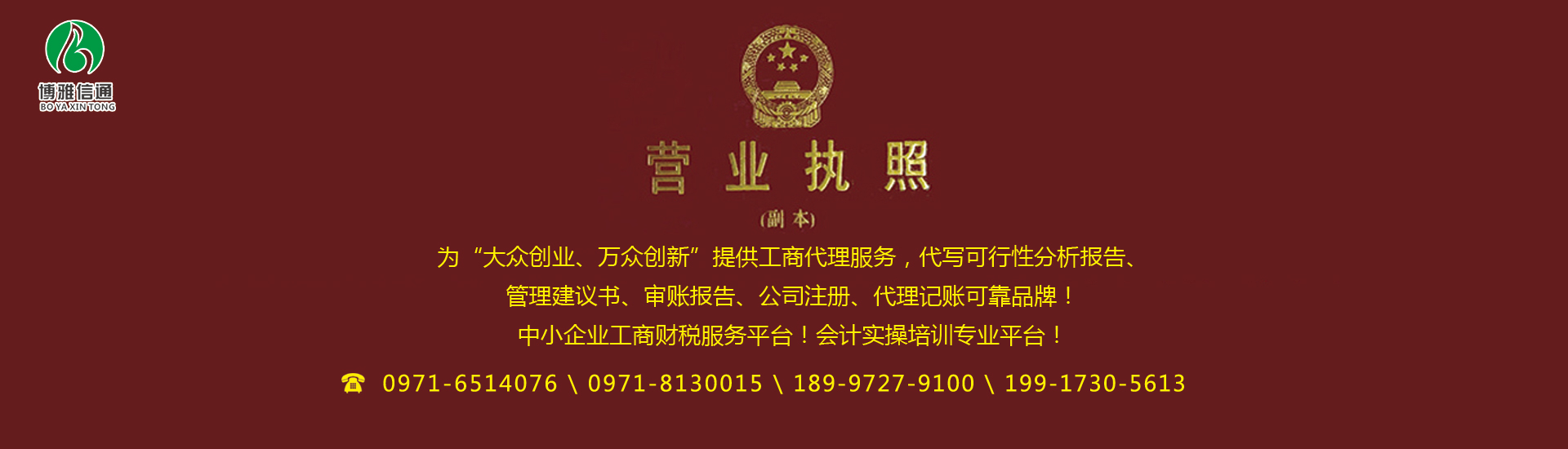 北京博雅信通會計服務有限公司西寧分公司為各中小企業(yè)提供各種專業(yè)工商財稅會計服務。包括公司設立籌劃、公司注冊、執(zhí)照變更、代辦注銷、代理記賬報稅、亂賬整理、會計實操培訓、會計職稱培訓(會計取證培訓)等一站式服務體系,誠信、專業(yè)、高效、省心! 公司簡介: 北京博雅信通會計服務有限公司西寧分公司 成立于2003年,積累了幾十個行業(yè)工商財稅會計服務經(jīng)驗,主要提供公司注冊、執(zhí)照變更、企業(yè)注銷、工商年報、代理記賬、納稅申報、會計培訓、財稅顧問等一系列服務。全程工商財稅老板們甩手我們代理,并且用足用好工商財稅優(yōu)惠政策,讓企業(yè)老板省心、省時、省事兒!節(jié)約會計核算和納稅成本,解放您的寶貴時間抓好企業(yè)經(jīng)營,做您的...